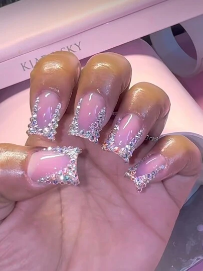 即刻升级您的风格,全套24片棺材形人造指甲贴,搭配裸色法式指甲贴和彩色边缘,并饰有水钻。闪亮日韩风女士指甲贴纸套装包含1块果冻胶和1把指甲锉。 - 彩色 - 查看 3