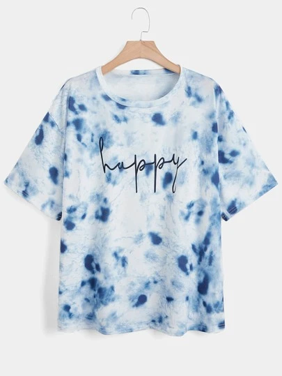SHEIN LUNE 大碼紮染字母圖案落肩T恤 - 彩色 - 查看 1