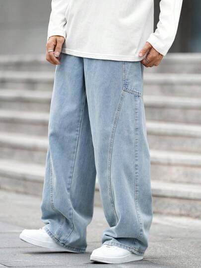 Manfinity EZcore 男士简约纯色日常穿着超宽腿宽松牛仔裤,纯色长款水洗宽松浅蓝色工装牛仔裤,适合丈夫、男朋友的礼物 - 淺色水洗藍 - 查看 6