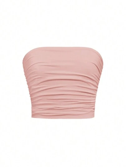 SHEIN 青少年女孩简约舒适褶皱弹性贴身休闲抹胸胸罩 - 粉色 - 查看 1