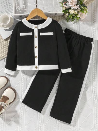2 件套年轻女孩撞色系带纽扣圆领长袖上衣和裤子套装 - 黑色 - 查看 1
