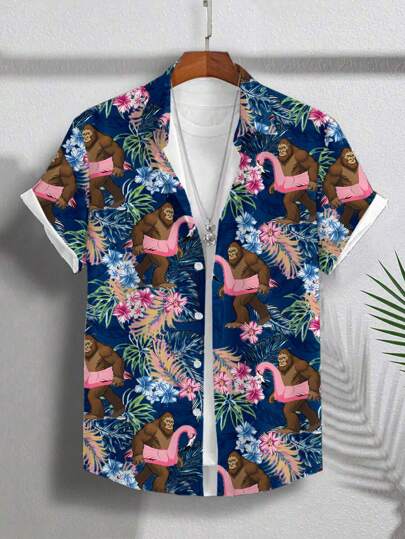 Genlund 男士热带植物与大猩猩印花短袖休闲衬衫