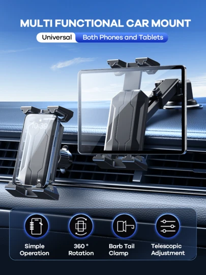 REMAX 通用型360°旋转车载手机/iPad平板电脑支架;三合一多功能设计,适用于中控台、空调出风口和挡风玻璃;稳固抓握;汽车旅行配件;iPad车载支架;汽车配件 - 黑色 - 查看 1
