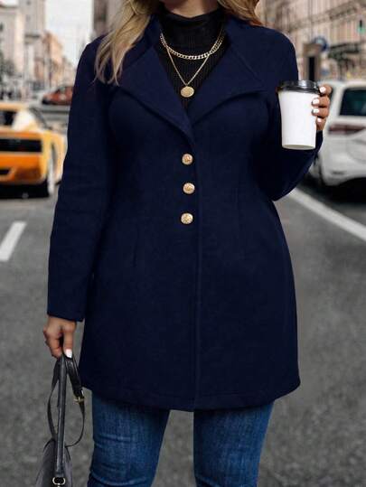 SHEIN Clasi 大码女式单排扣长袖优雅外套,秋冬 - 藏蓝色 - 查看 1