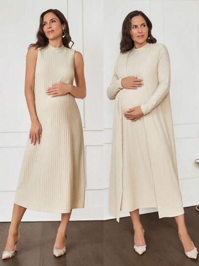 MaterniWear 2 件孕妇休闲套装:长袖飘逸开衫夹克和连衣裙,秋冬 - 杏色 - 查看 2