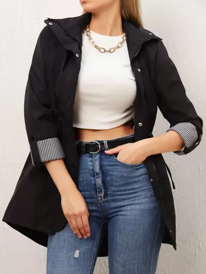 RueChic 雙色格子捲邊袖抽繩細節外套 - 黑色 - 查看 1