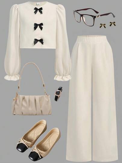 Girlism 青少年女孩休闲时尚圆领荷叶边泡泡袖纽扣上衣和长裤套装 - 杏色 - 查看 10