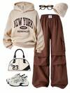 Sparklyn 2 件套青少年女孩字母印花连帽卫衣 + 绿色工装裤休闲街头风格服装,秋冬