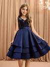 青少年女孩 V 领细肩带亮片撞色网眼腰连衣裙,优雅适合舞会、派对、学校开学典礼