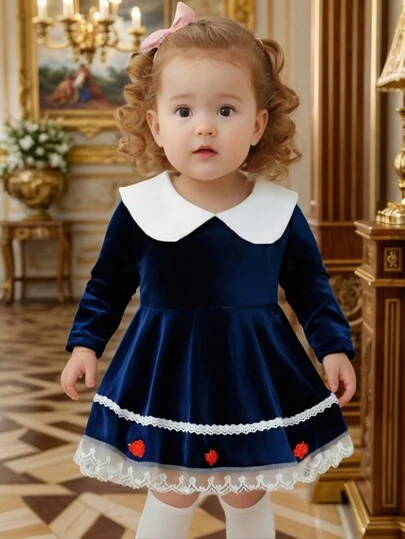 SHEIN Elladie kids 女童天鹅绒复古法式宫廷风长裙,秋冬 - 藏蓝色 - 查看 1