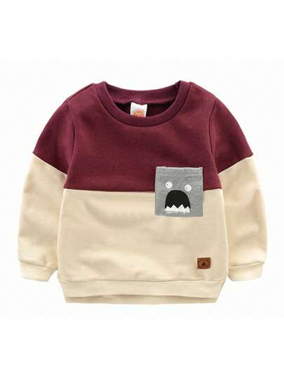 幼兒女童卡通印花對比色運動衫,帶補丁口袋 - 酒紅色 - 查看 1
