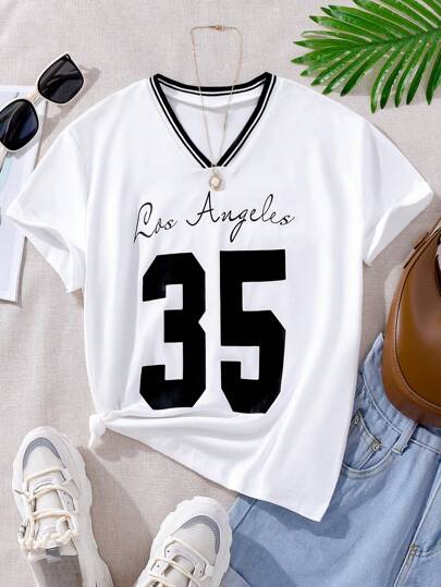 女童休闲洛杉矶数字印花 V 领短袖 T 恤,百搭日常穿着 - 白色 - 查看 1