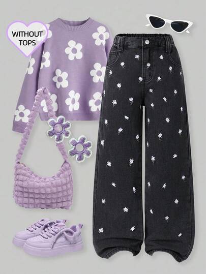 女童休闲水洗牛仔裤,刺绣设计,直筒裤 - 灰色 - 查看 1