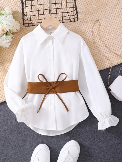 女孩荷葉袖腰帶襯衫 - 白色 - 查看 1