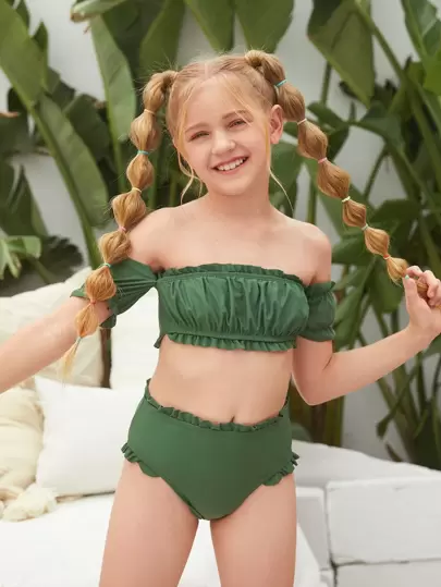 青少年女孩荷叶边露肩比基尼套装夏季海滩 - 軍綠色 - 查看 1