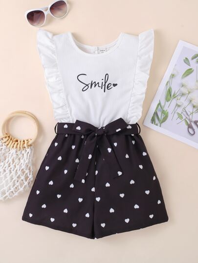 女孩愛心和字母圖案荷葉邊連身短褲 - 黑與白 - 查看 1
