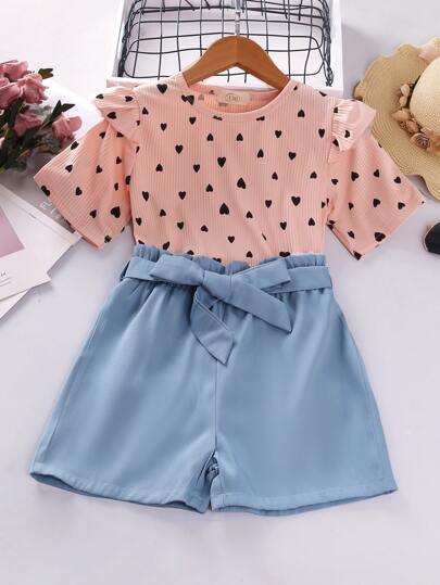 女孩愛心圖案荷葉邊T恤和附腰帶短褲 - 彩色 - 查看 1