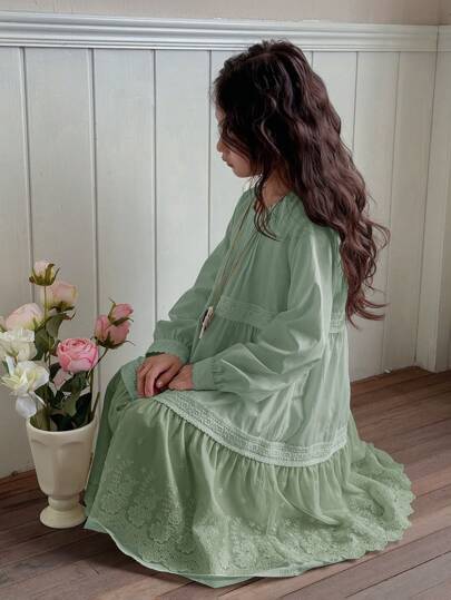 女童中长款 A 字形蕾丝拼接纯色公主风圆领长袖连衣裙,加大码