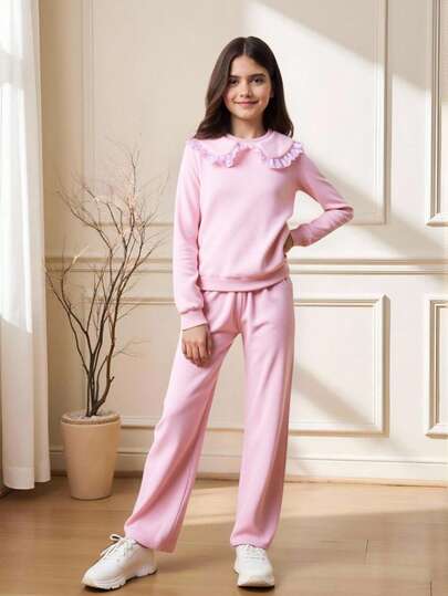 女童彼得潘领荷叶边长袖运动衫和松紧腰裤休闲校园淑女装
