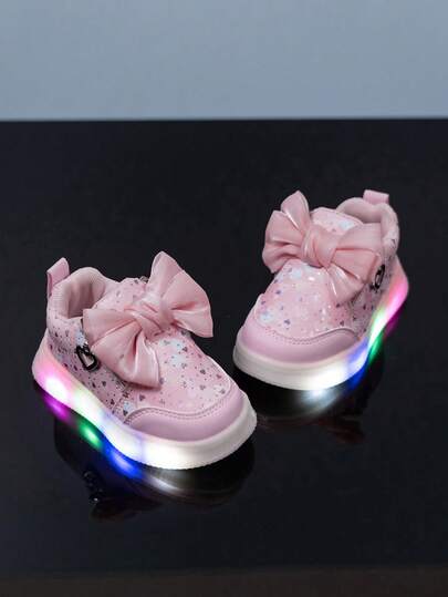 女童公主七色LED灯鞋,舒适软底蝴蝶结休闲鞋 - 粉色 - 查看 1
