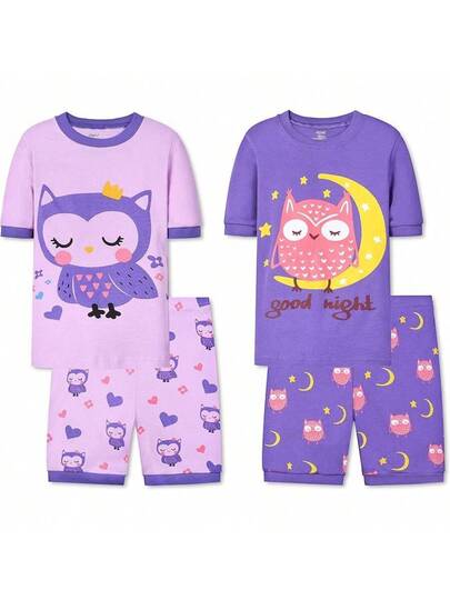 Girls Pure Cotton Summer Pjs Size 2T-14Years, Little Girls Short Sleeve 4-Piece Sleepwear Kids Toddler Pajamas Set
