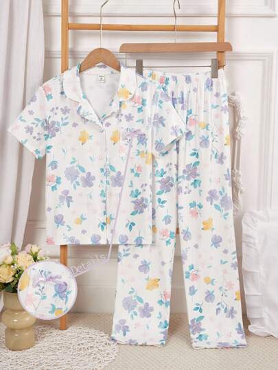 女童修身休闲轻便睡衣套装,优雅彩色花卉印花翻领开衫和长裤,2 件套家居服 - 白色 - 查看 1