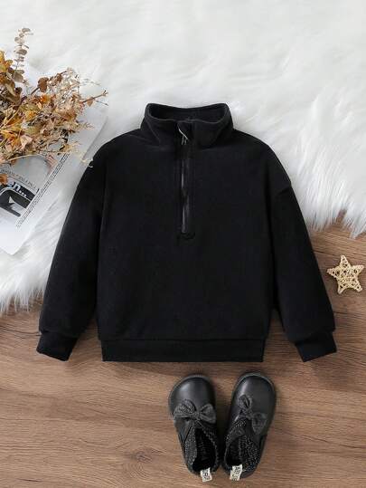 SHEIN 女童純色簡約半高領拉鍊運動上衣 - 黑色 - 查看 1