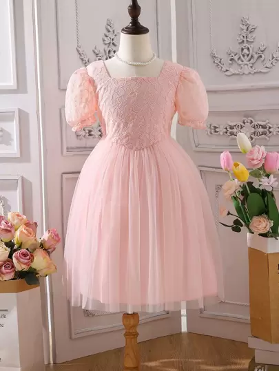 女孩方領泡泡袖網紗邊連衣裙 - 藕粉色 - 查看 1