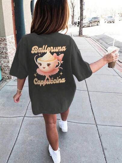 女童和青少年学生休闲印花深灰色圆领短袖T恤,夏季上衣 - 深灰色 - 查看 1
