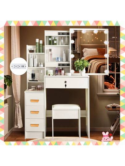 Girls Vanity Desk With Charging Station, Sliding Mirror, 3 Color Light Settings, Makeup Table With 4 Drawers, 7 Cabinets, Dressing Vanity Set With Stool For Bedroom - 白色 - 查看 7