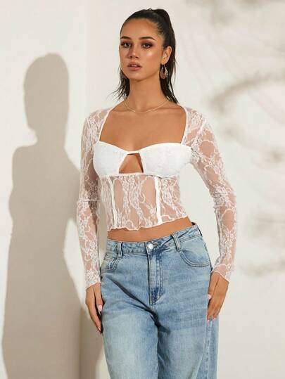 Glamine 女士优雅白色蕾丝上衣,春夏上衣,非常适合情人节、度假和大学生,时尚露背上衣,情人节透视上衣白色蕾丝上衣 - 白色 - 查看 2