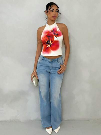 Glamine 度假风格花卉印花性感露背露背短款上衣,春夏、复活节、毕业典礼、乡村音乐会、俱乐部、露背上衣、度假 - 杏色 - 查看 2