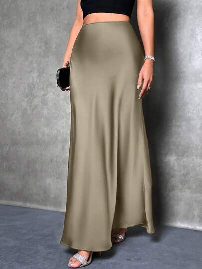 Glamine 女士优雅缎面半身裙,百搭鱼尾下摆A字裙,日常穿着 - 卡其色 - 查看 1
