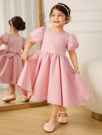 Glamorique Kids 女婴优雅粉色提花泡泡短袖公主裙,花童礼服,配有可拆卸蝴蝶结,适合一周岁生日派对、生日、表演、婚礼等场合。 - 粉色 - 查看 5