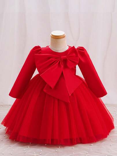 Glamorique Kids 圣诞女婴服装女婴圣诞派对生日连衣裙,秋季服装长袖红色优雅 3D 蝴蝶结薄纱飘逸网眼蓬松公主裙 - 紅色 - 查看 3