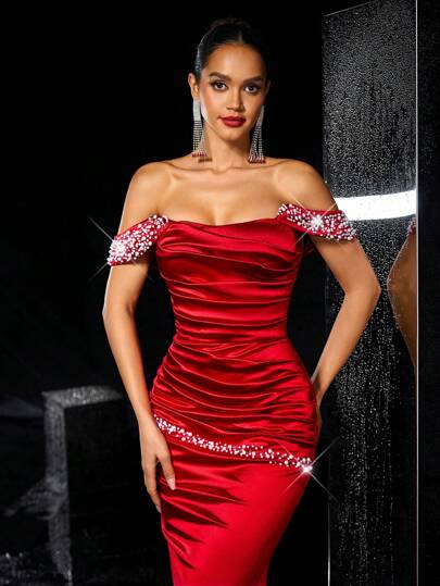 Glamrae 优雅华丽的红色弹性亮缎露肩垂袖褶饰奢华水钻和人造珍珠工艺鱼尾下摆及地长裙婚礼宾客礼服,适合晚宴、单身派对、生日约会、婚礼活动、情人节晚礼服、正式礼服