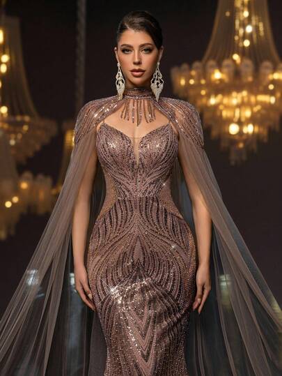 Glamrae 优雅奢华串珠亮片花卉网眼泡泡袖美人鱼长裙,适合婚礼、单身派对、度假、庆典、晚会正式穿着(重度装饰)