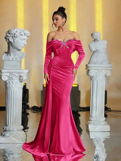 优雅奢华露肩袖口褶皱设计弹力天鹅绒针织面料奢华缀饰侧褶鱼尾裙,婚礼宾客礼服,适合婚礼、联欢会、派对和特殊活动等正式场合,派对礼服,晚礼服
