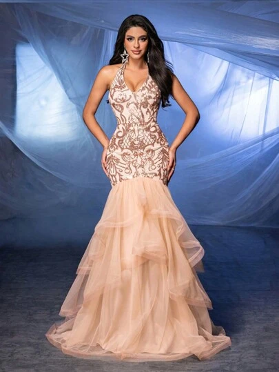 Glamrae 优雅奢华香槟色定位亮片 V 领高腰紧身后下摆马尾夸张网眼蓬松连衣裙约会单身派对返校季婚礼活动重型晚宴舞会礼服正式晚间婚礼宾客礼服,适合毕业典礼