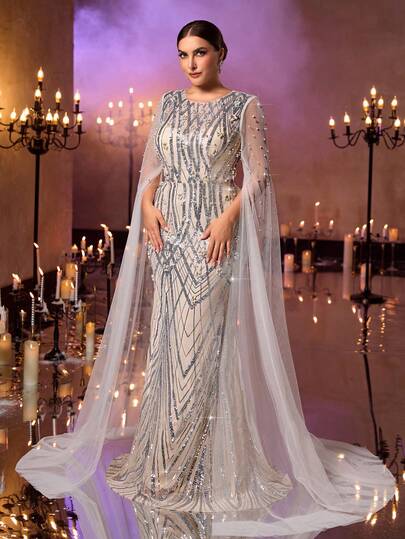 Glamrae 加大码优雅奢华香槟色圆领透明喇叭袖重磅缀饰亮片网眼美人鱼下摆连衣裙,适合派对、庆典、婚礼场合、正式晚礼服