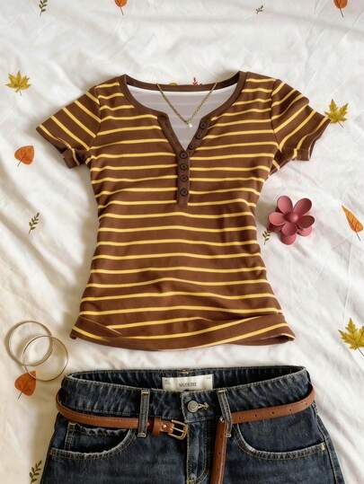 Glimmora 条纹数码印花时尚简约V领短袖T恤,送朋友的礼物