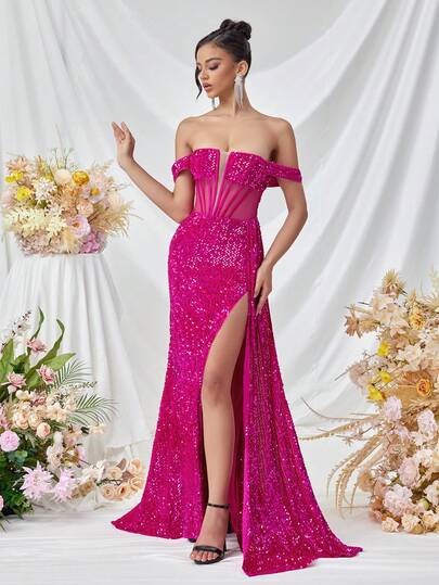 ADYCE 閃亮露肩魚骨腰長絲帶前開叉無背派對晚禮服 - 玫紅色 - 查看 1