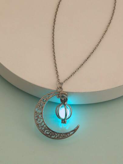 夜光月亮和燈籠吊墜項鏈 - 銀色 - 查看 1