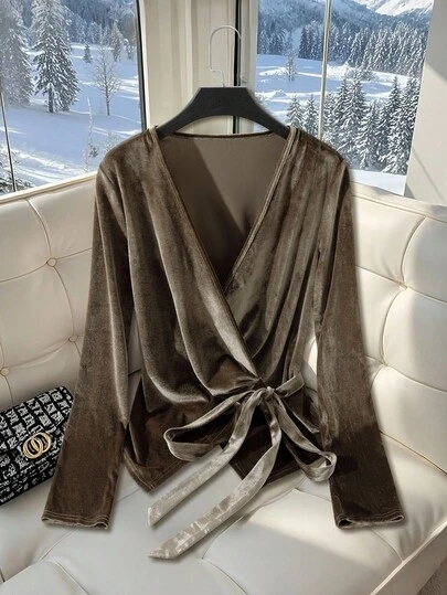 GlowEve 女士优雅浪漫奢华交叉天鹅绒蝴蝶结衬衫 - 軍綠色 - 查看 2