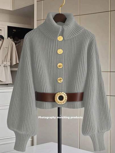 GlowEve 翻领金属纽扣灯笼袖时尚百搭女式毛衣 - 灰色 - 查看 1