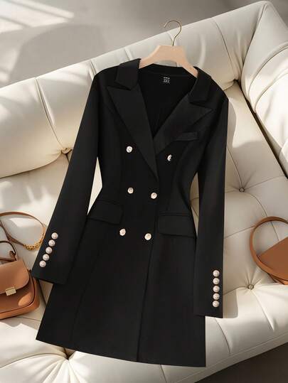 GlowEve 女式秋季通勤中式立领金属双排扣中长夹克 - 黑色 - 查看 1
