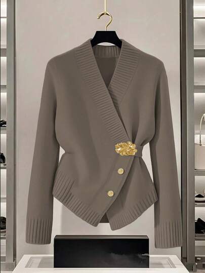 GlowEve 女士蓝色毛衣,新款秋冬金属纽扣不对称开襟羊毛衫,百搭通勤风格 - 深灰色 - 查看 7