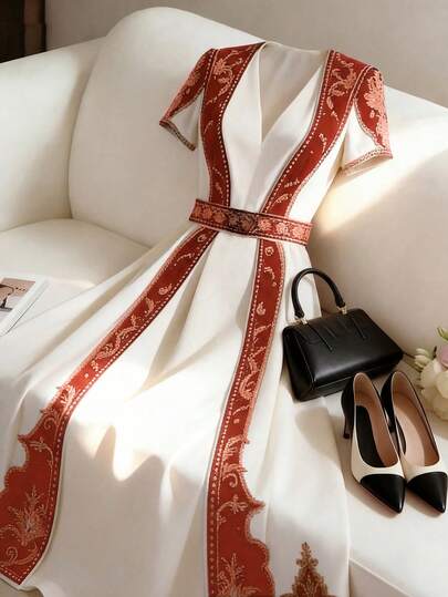 GlowEve 女士优雅时尚V领短袖收腰印花长连衣裙,适合日常通勤和休闲穿着