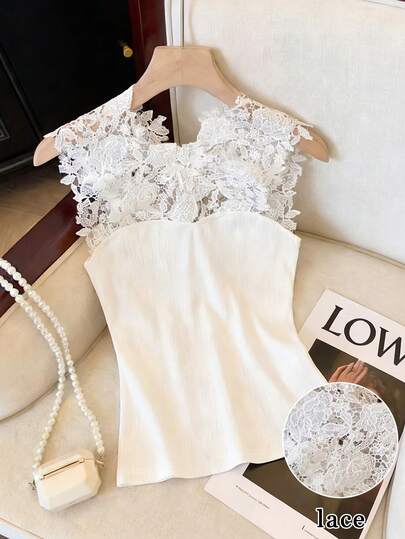 GlowEve 女士夏季针织弹力修身蕾丝拼接镂空V领短袖休闲优雅T恤,蕾丝饰边随机裁剪 - 白色 - 查看 1
