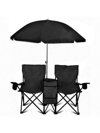 GoTeam Portable 2-Seat Folding Camp Chair With Cooler, Umbrella & Cup Holders – Outdoor Picnic, Beach, Or Tailgate Seating – Carry Case Included
